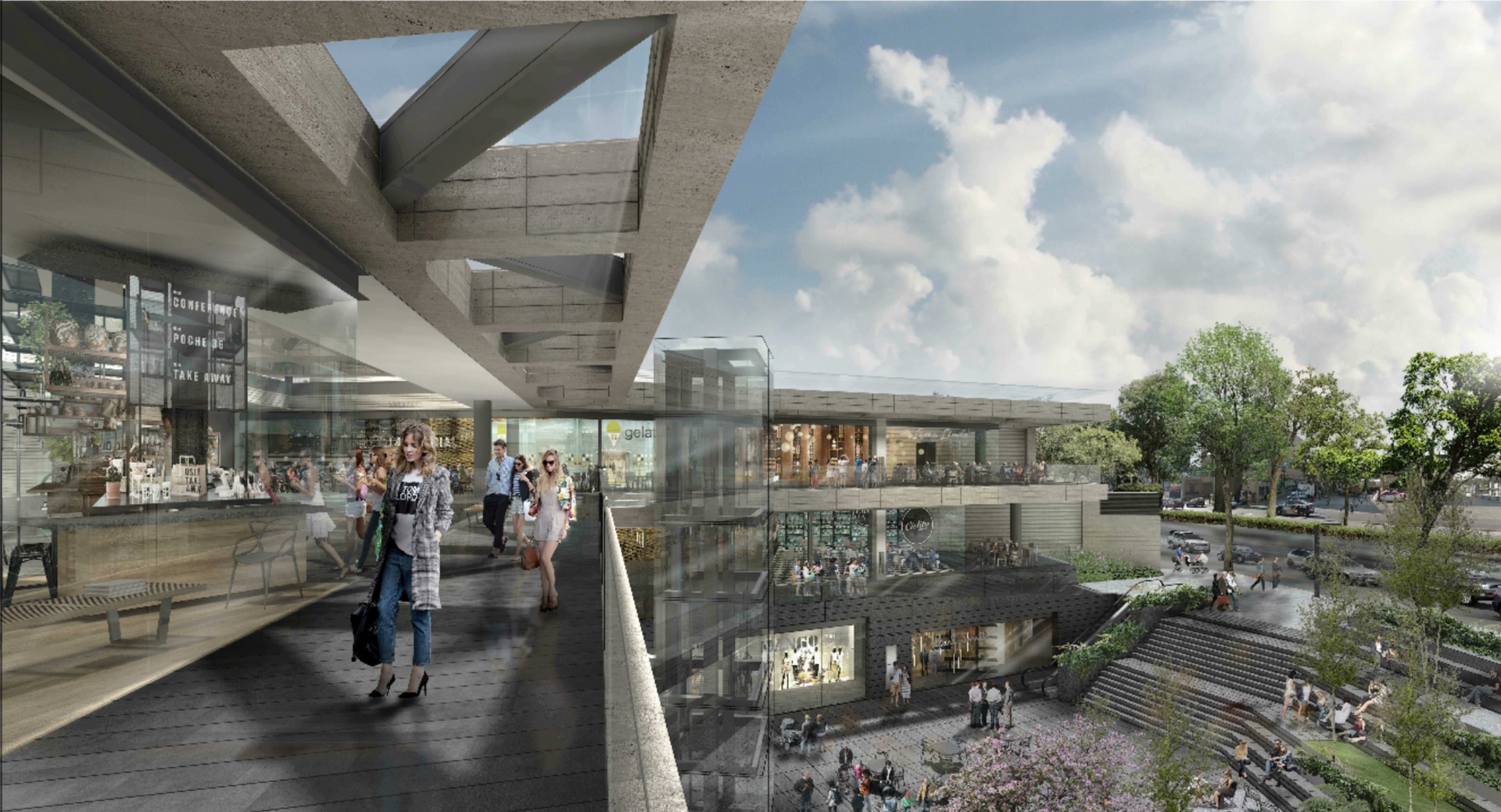 Plaza comercial con locales, restaurantes y plaza central.